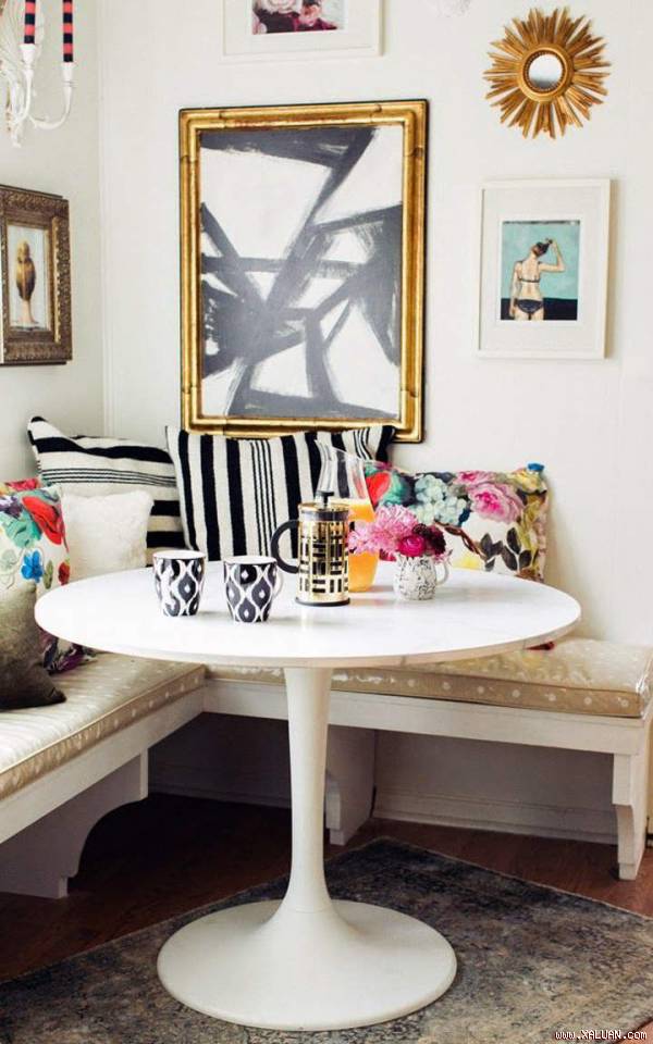 Để tạo ra được một góc nhỏ riêng tư ngay trong phòng ăn nhỏ, bạn nên sử dụng hai chiếc ghế băng và xếp chúng đối xứng nhau. Kiểu sắp đặt này sẽ giúp bạn có một góc nhỏ hoàn hảo cho gia đình. Nếu có một ô cửa sổ ngay góc bàn thì góc nhỏ này không thể chê vào đâu được!