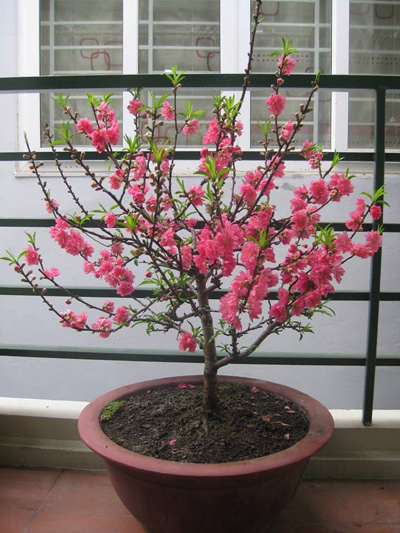 Cây đào nhỏ nhưng hoa kín hết các cành.
